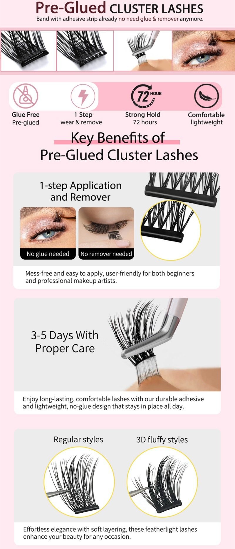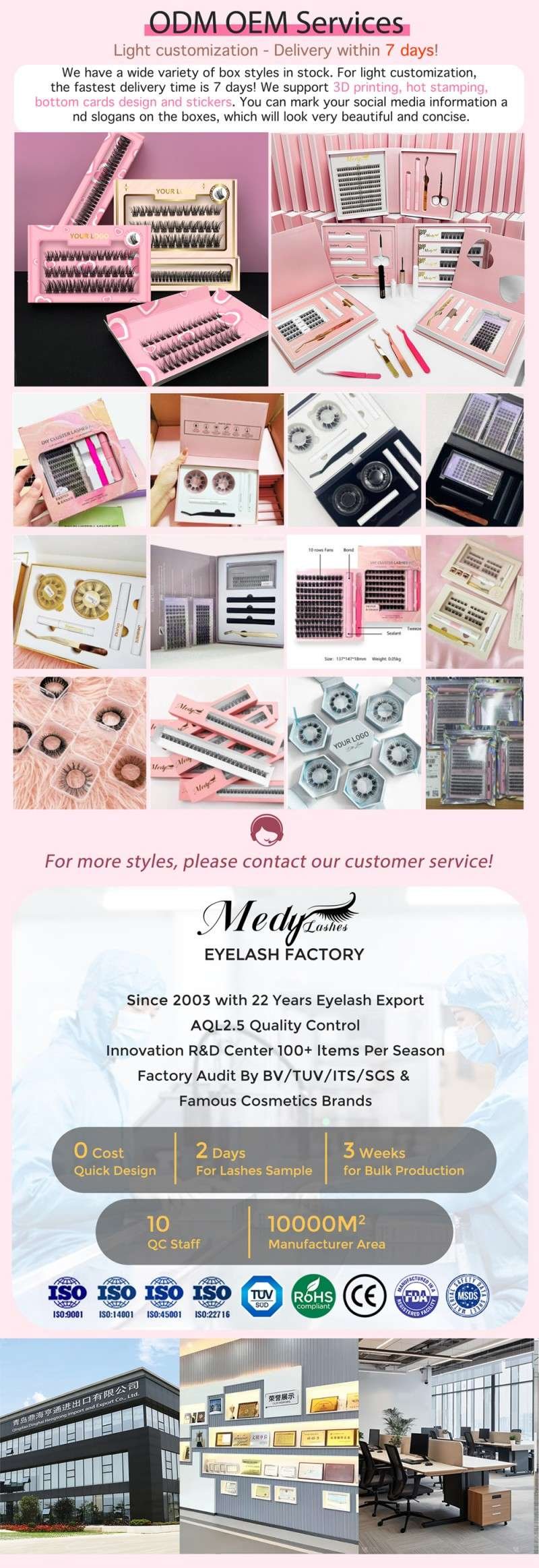 Destaques: Pestanas postiças sintéticas artesanais com propriedades autocolantes, sem necessidade de cola para aplicação. Apresenta mais de 200 estilos e opções de embalagem com logótipo personalizável. Certificado pela CE, FDA e autodeclaração de cosméticos para conformidade com a UE/Reino Unido, garantindo elevados padrões de segurança e acesso ao mercado. Adequado para uso repetido 25 a 30 vezes com os devidos cuidados.